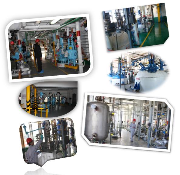 公司擁有各種設(shè)備3000多臺(tái)/套,品種包括反應(yīng)釜、儲(chǔ)罐、換熱器、壓縮機(jī)、離心機(jī)、過濾器、螺桿真空泵、水環(huán)真空泵、磁力泵、屏蔽泵、離心泵等,其中反映釜容積為500-20000升,總反應(yīng)能力達(dá)到800立方米,儲(chǔ)罐容積從1立方米到100立方米不等,總?cè)莘e達(dá)到10000立方米以上。設(shè)備的材質(zhì)包括:哈氏合金、304L、316L、鋼襯玻璃、鋼襯鎳、鋼襯鈦、鋼襯四氟、石墨等 ,能夠完成胺化、氯化、氟化、格式化、重氮化等各種反應(yīng)。