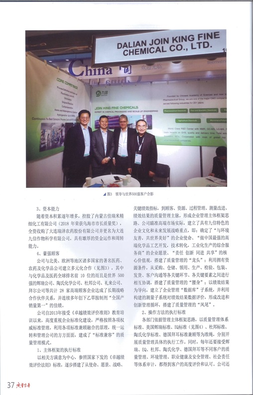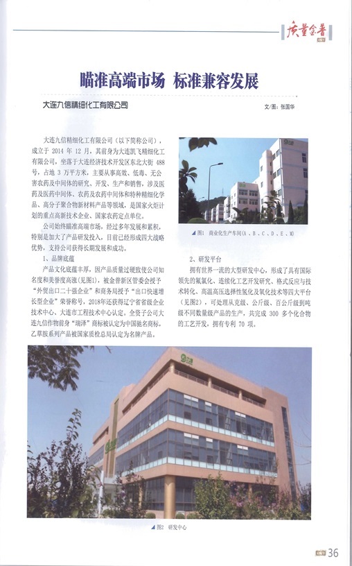 “金普新區(qū)質(zhì)量獎”是金普新區(qū)最權(quán)威、最高級和最全面的政府榮譽(yù)。我公司于2014年榮獲“金普新區(qū)質(zhì)量獎”,成為全面引入先進(jìn)質(zhì)量管理模式的成功企業(yè),也成為金普新區(qū)質(zhì)量經(jīng)營管理的標(biāo)桿企業(yè)。為大力宣傳和推廣標(biāo)桿企業(yè)的成功經(jīng)驗(yàn),更好地激勵轄區(qū)其他企業(yè)采用先進(jìn)的管理方法經(jīng)營企業(yè),提升全面質(zhì)量管理經(jīng)營水平,加強(qiáng)金普新區(qū)質(zhì)量強(qiáng)區(qū)建設(shè),金普新區(qū)市場監(jiān)督管理局于2020年在《質(zhì)量金普》起航號期刊上,對大連九信精細(xì)化工有限公司等12家企業(yè)的先進(jìn)管理方法和管理理念進(jìn)行了宣傳。